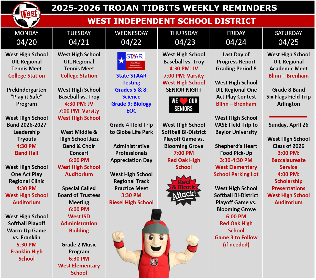 • Friday, May 15, is the West High School Class of 2026 Graduation Ceremony at 7:30 PM at Trojan Field (Gates will open at 6:30 PM.). There will be a live-stream of the ceremony on the West ISD YouTube Channel.